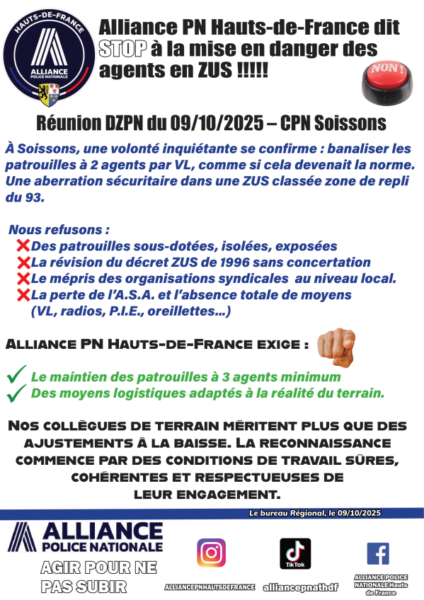 CPN SOISSONS : STOP ! A LA MISE EN DANGER DES PS EN Z.U.S. À Soissons, une volonté inquiétante se confirme : banaliser les patrouilles à 2 agents par VL, comme si cela devenait la norme. Une aberration sécuritaire dans une ZUS classée zone de repli du 93... Publication : 9 octobre 2025 Lire la suite... Aisne, Bureau Régional, Hauts de France